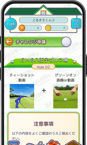 見事ワンオンが成功したら、アプリからプレイしたホールを選んで「ショット動画」と「グリーンオン画像」を添付して送信!